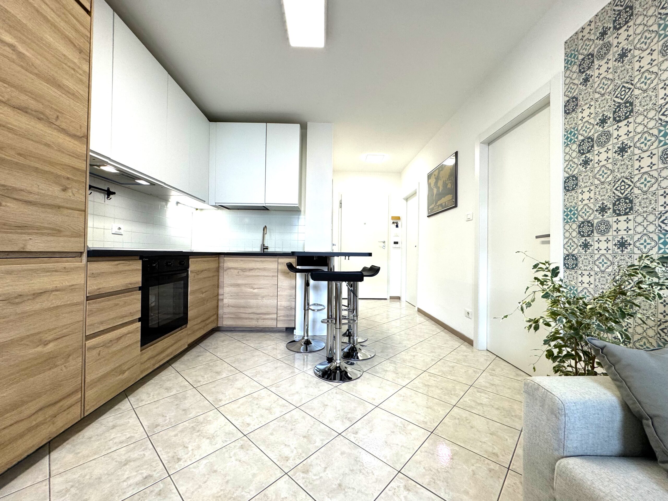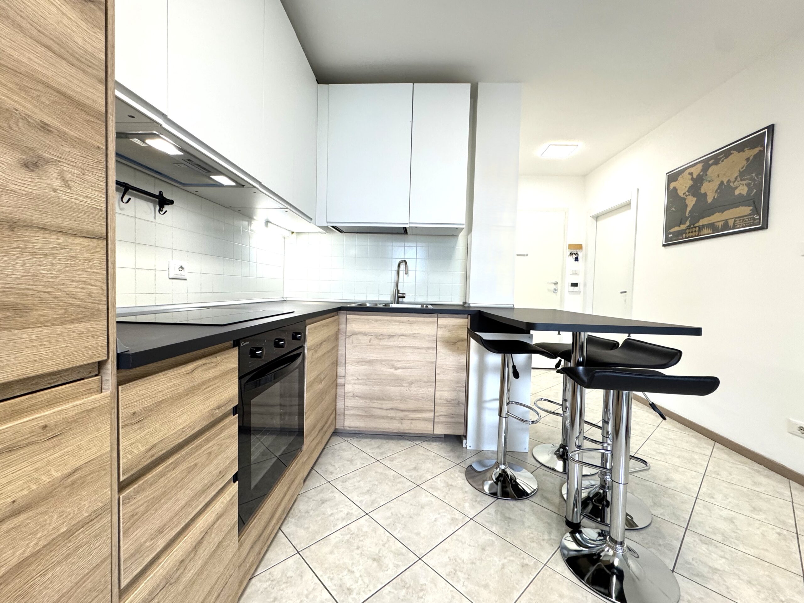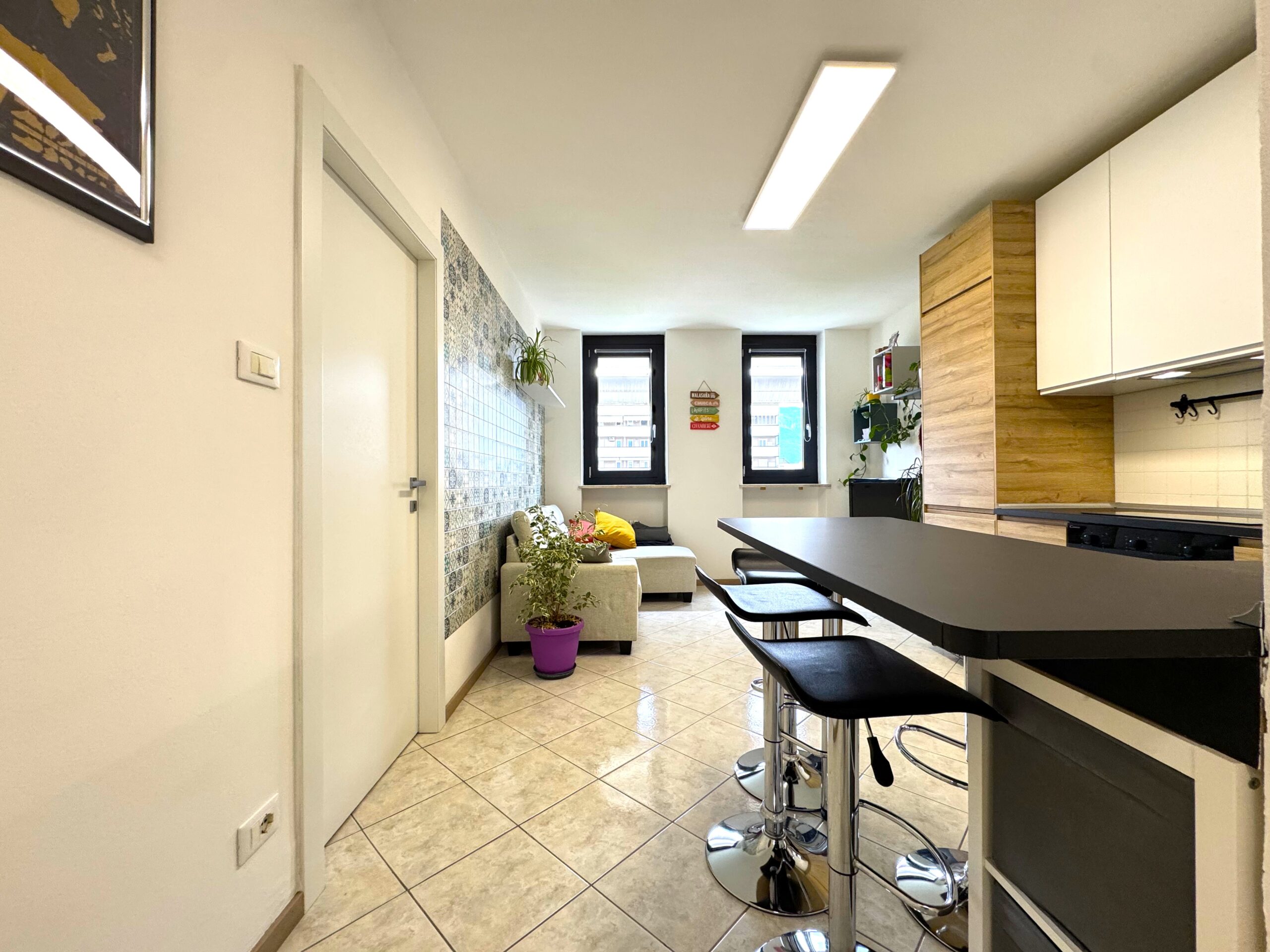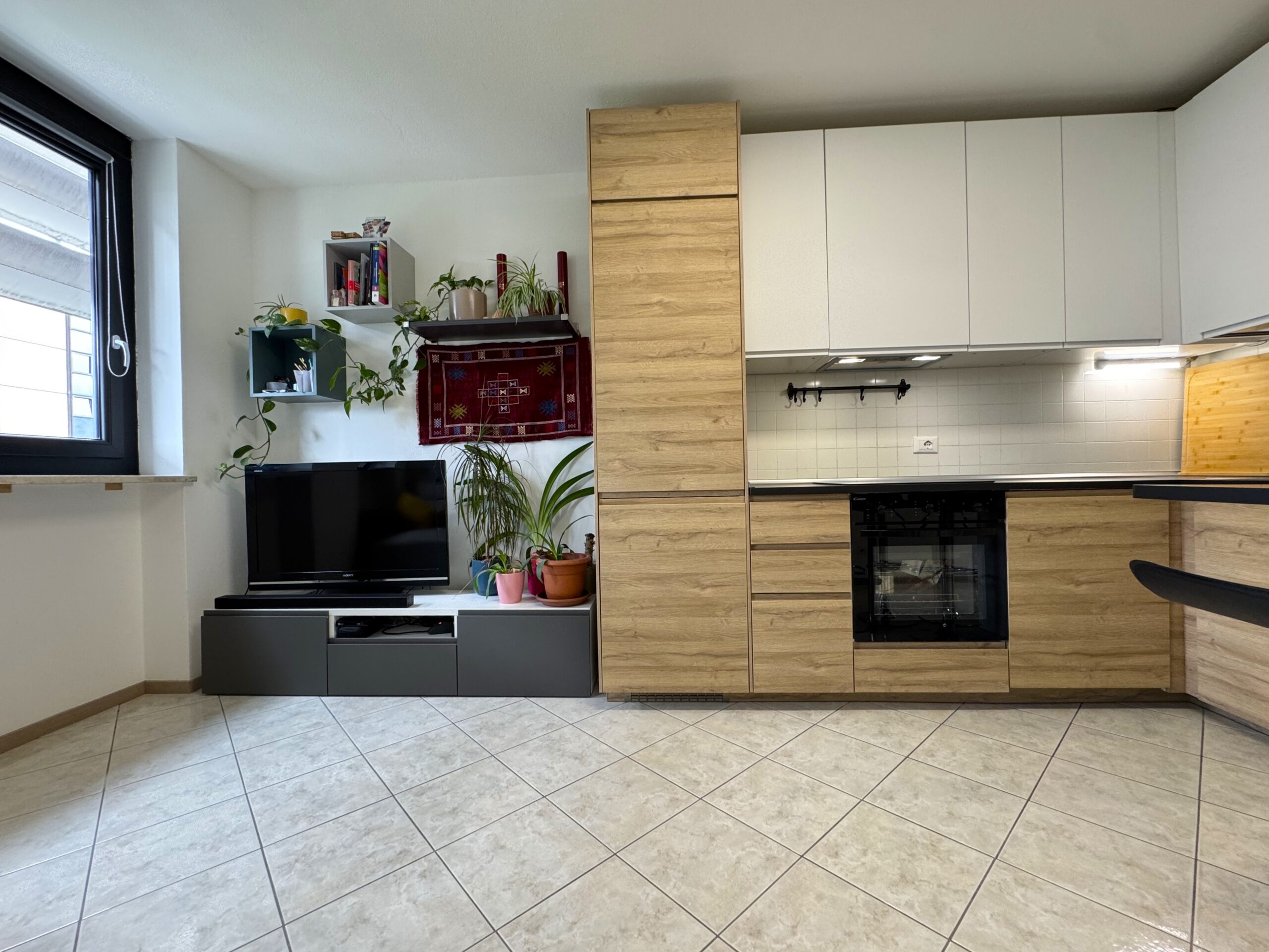 L’ingresso conduce in un ambiente armonioso e ben organizzato, dove il soggiorno con cucina open space rappresenta il vero cuore della casa: luminoso, accogliente e perfetto per momenti di relax o convivialità. La penisola in cucina è stata pensata con possibilità di estensione del tavolo snack, per ospitare fino a 7 persone.